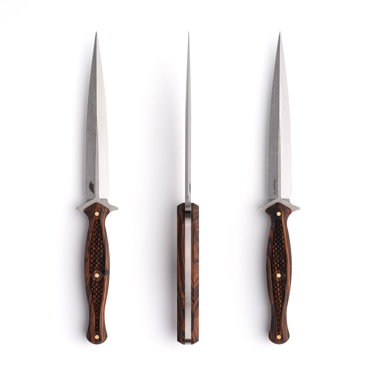 The Custom Ironwood FKX Dagger is a testament to exceptional craftsmanship and tactical elegance. This dagger is forged with a focus on durability, precision, and beauty, meeting the needs of collectors and those who demand a reliable blade in the field. The refined ironwood handle adds a unique, natural texture and warmth to the grip, ensuring style and comfort. Brass pins complement the ironwood's rich tones, enhancing this piece's structural integrity and aesthetic appeal.