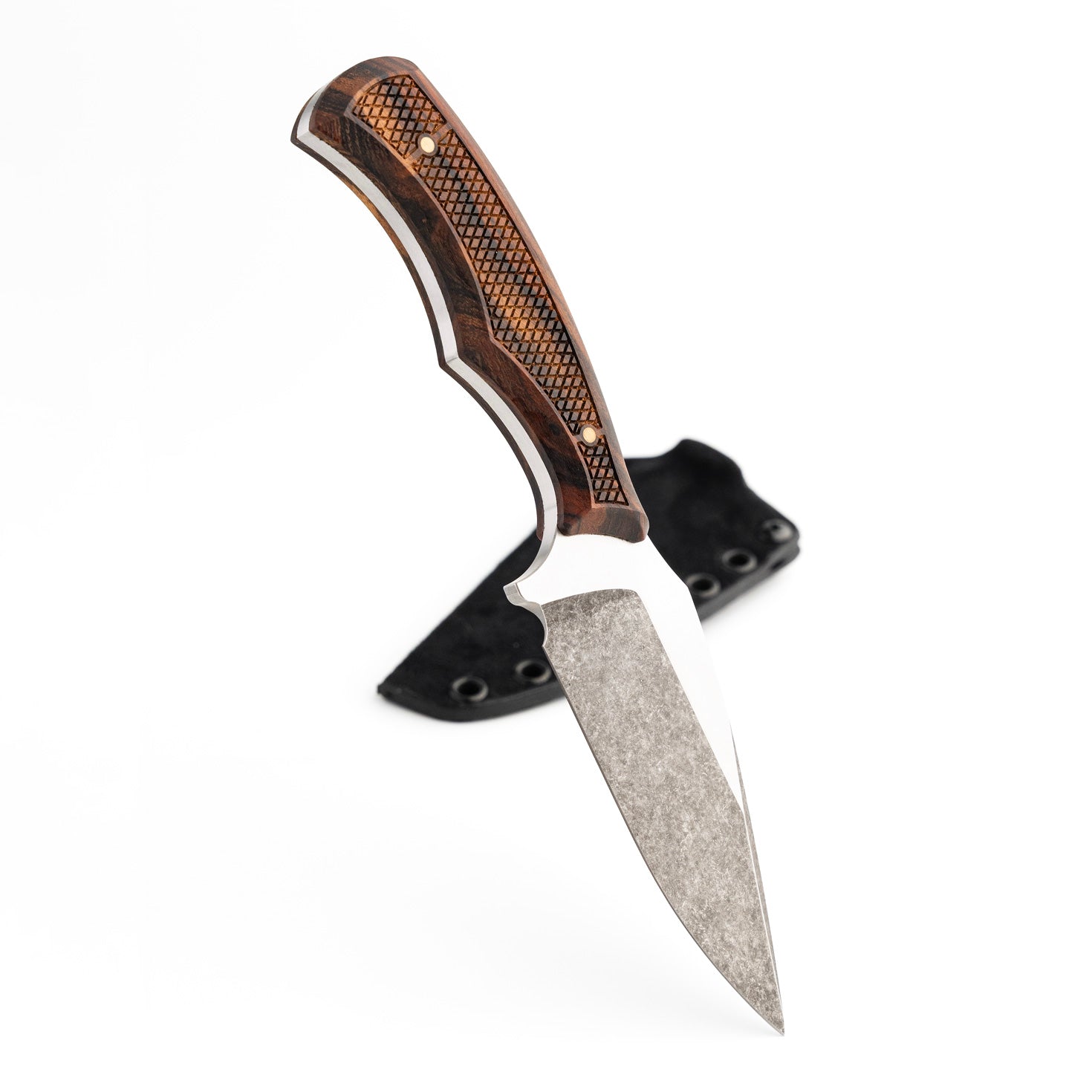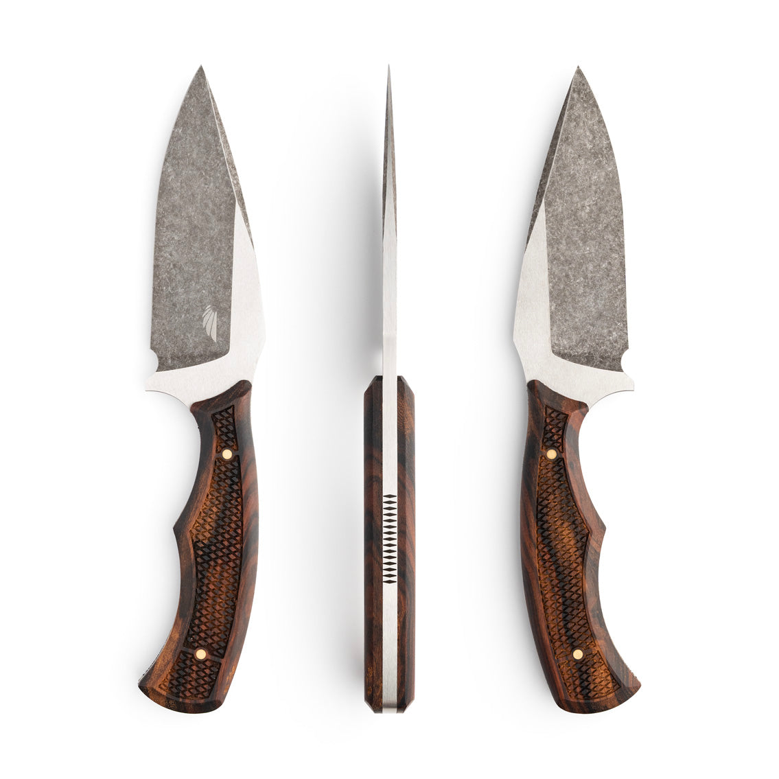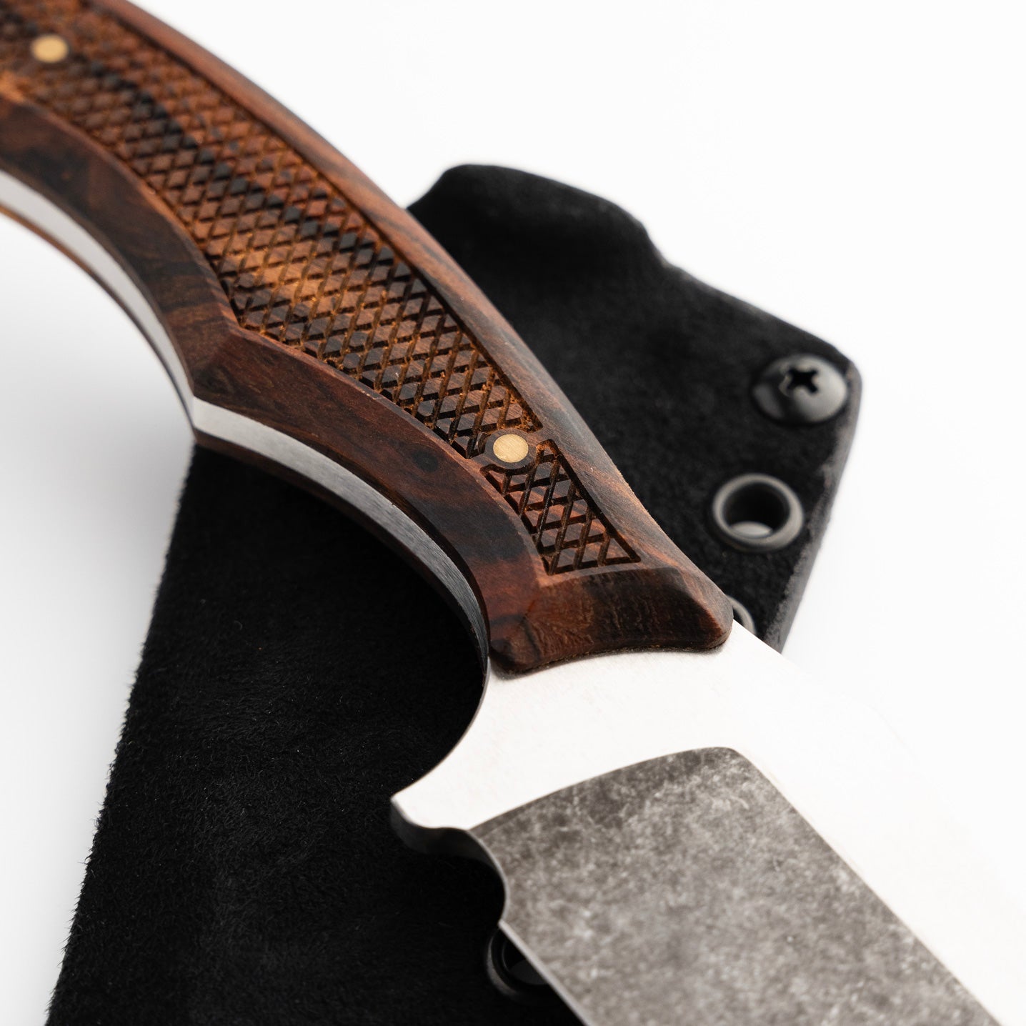 Beyond its remarkable capabilities, the Raider Ironwood stands as a genuine work of art. The handle features hand-fit custom Ironwood, delivering both aesthetic appeal and robust durability. Adding to the knife’s distinctive charm, a pointed checkering handle that mimics the grip of a classic wooden rifle, offering a nostalgic nod to traditional craftsmanship while ensuring a secure grip. Each custom Raider is polished by hand, a labor-intensive process that takes hours of meticulous work to ensure that every detail is perfect. The spine of the handle showcases an intricate weave engraving design that not only adds a unique visual element but also complements the overall look and feel of this exceptional blade. This intricate craftsmanship transforms the Raider into more than just a tool; it becomes a statement piece that reflects the dedication and passion poured into its creation.