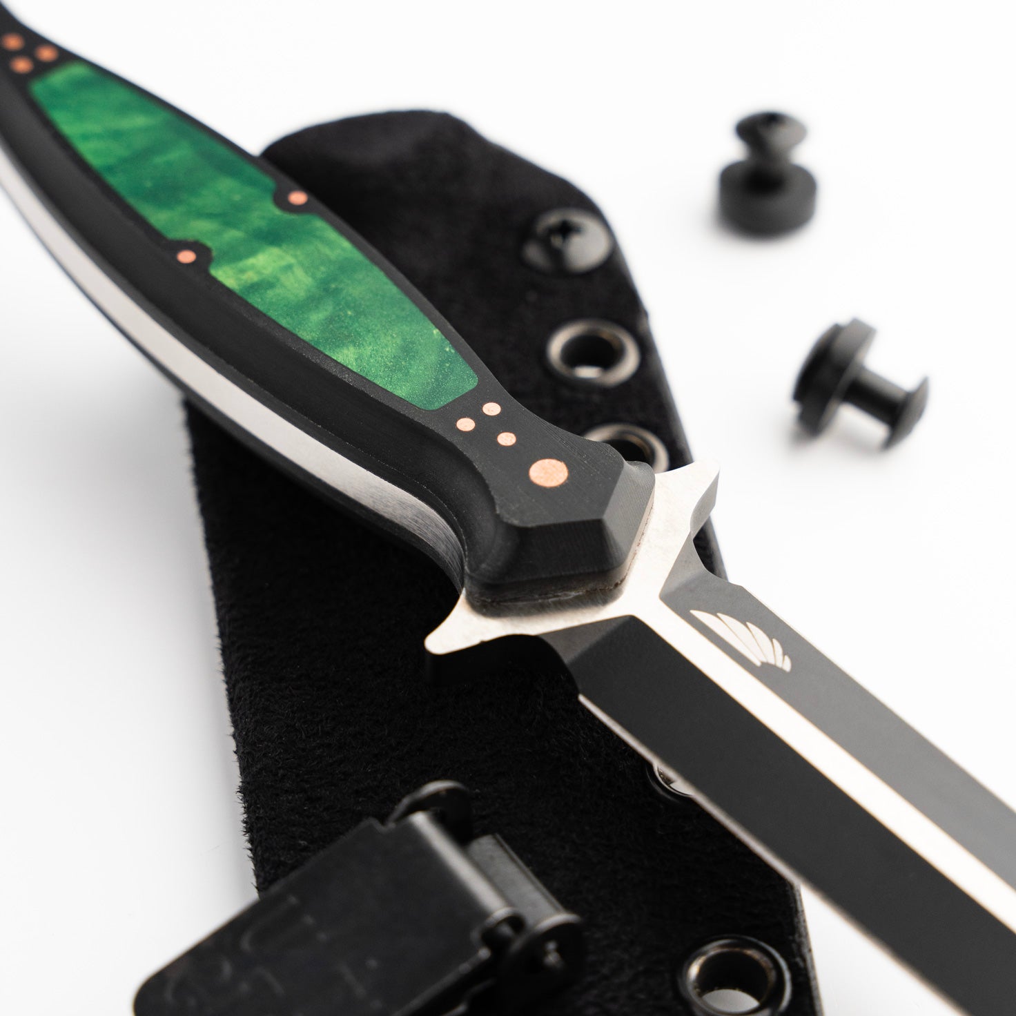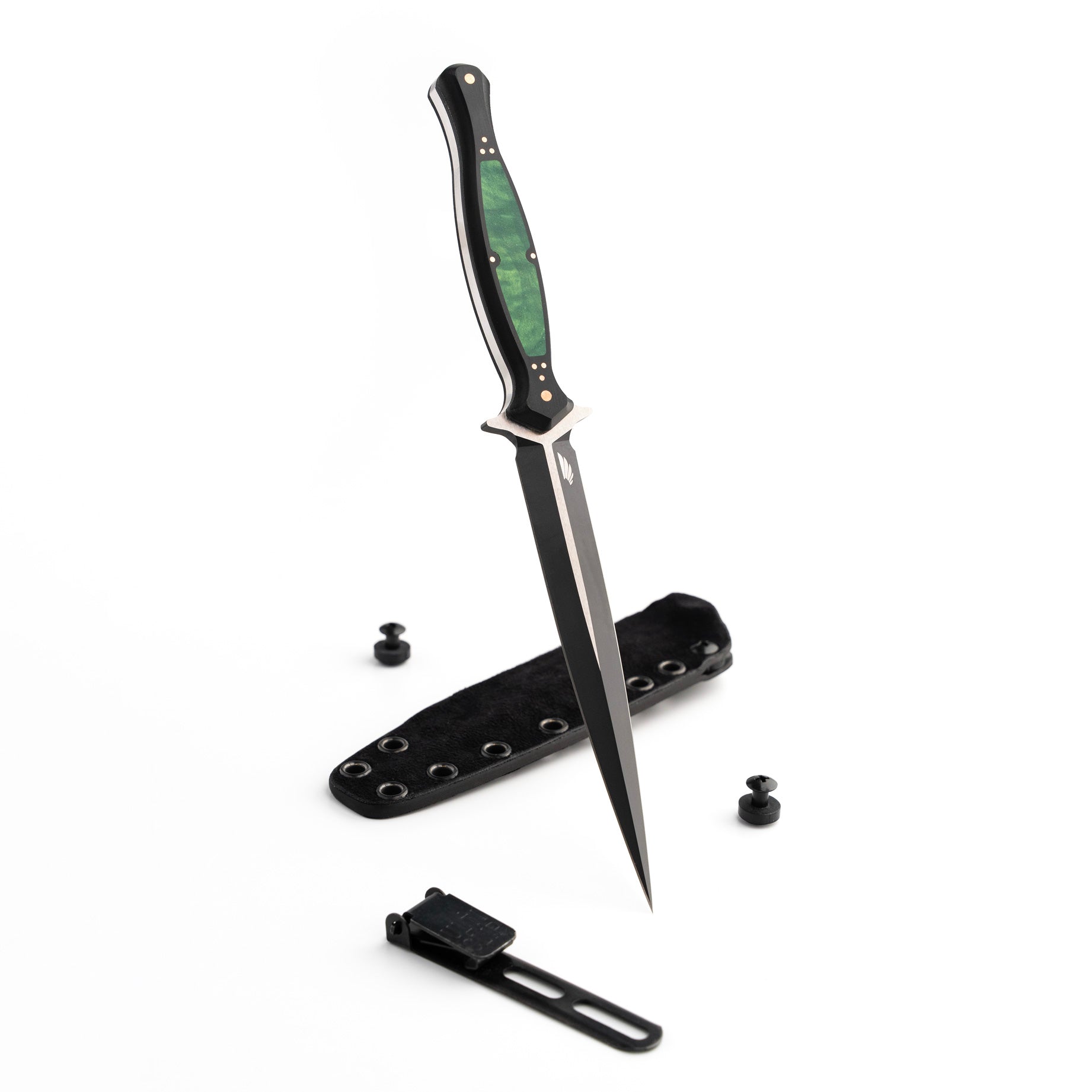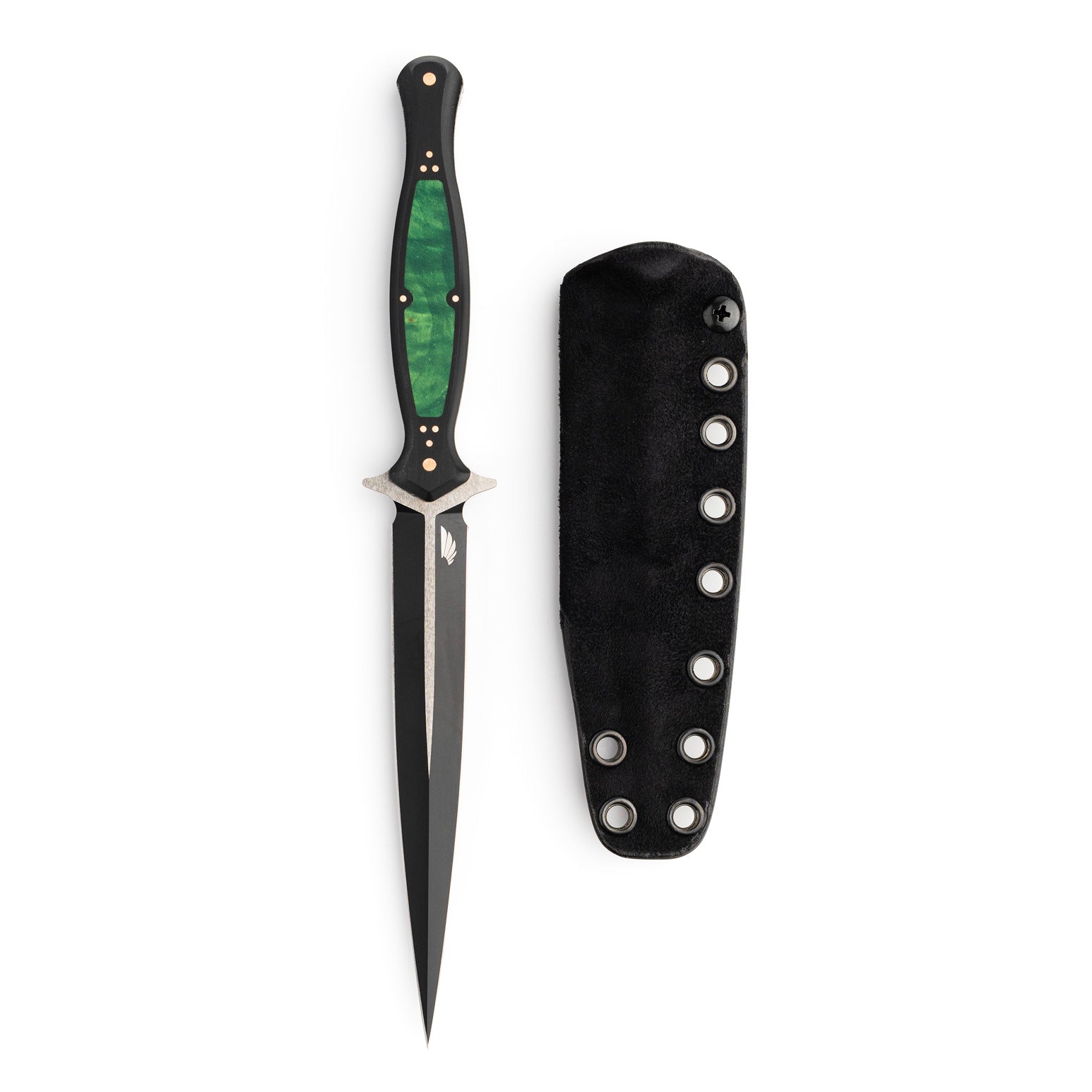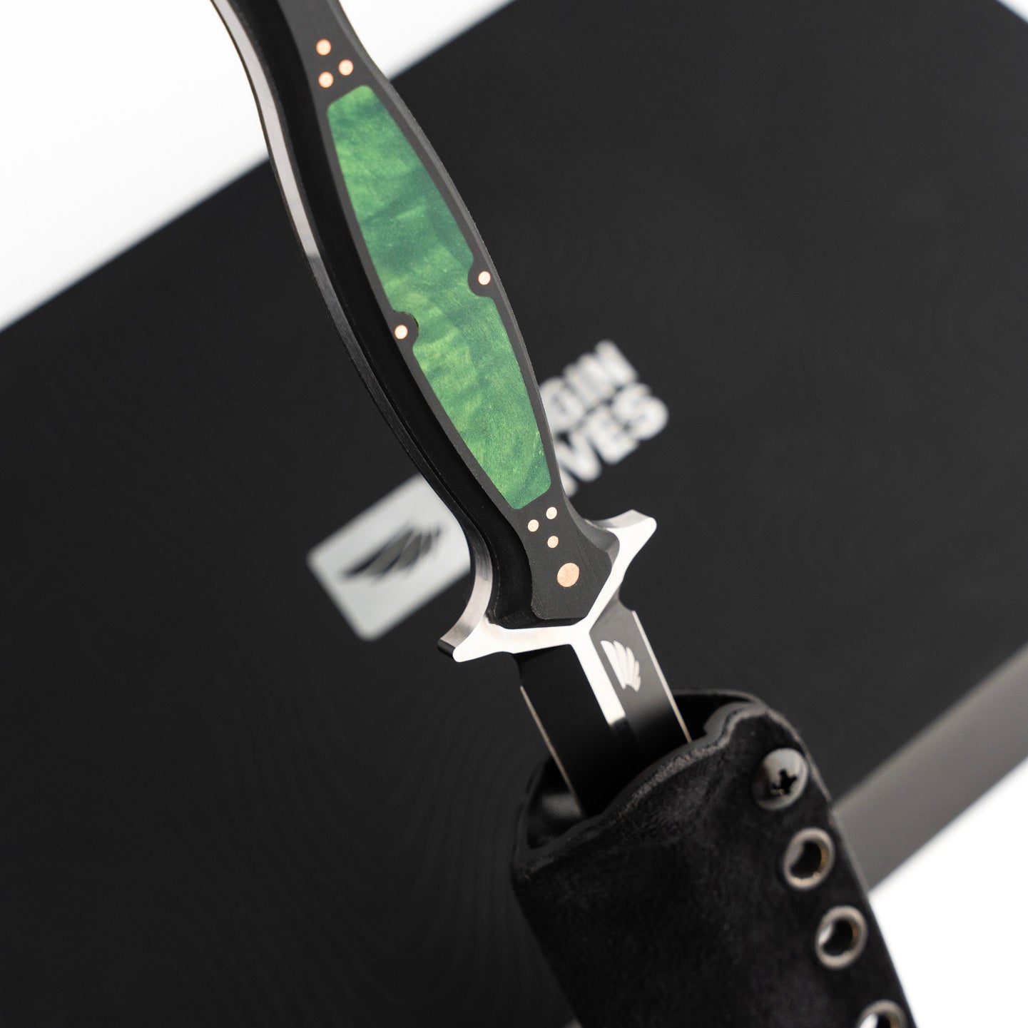 The handle of the FKX Dagger is made from Black Paper Micarta, providing a durable yet comfortable grip for optimal maneuverability. A stunning, intricately carved jade maple inlay adorns the handle, featuring a custom geometric pattern that symbolizes the symmetry and attention to detail embodied in the dagger's design. Each jade maple inlay is meticulously set by hand to ensure perfect alignment, exemplifying the dedication to craftsmanship that Sangin Knives is known for. Additionally, the handle is secured with ten individually set and polished press pins, seamlessly blending functionality with aesthetics while ensuring the structural integrity of the handle. No detail has been overlooked in the creation of this dagger, and we are proud to present the Custom FKX Dagger as one of the finest pieces ever produced, paying homage to the iconic Fairbairn-Sykes style.