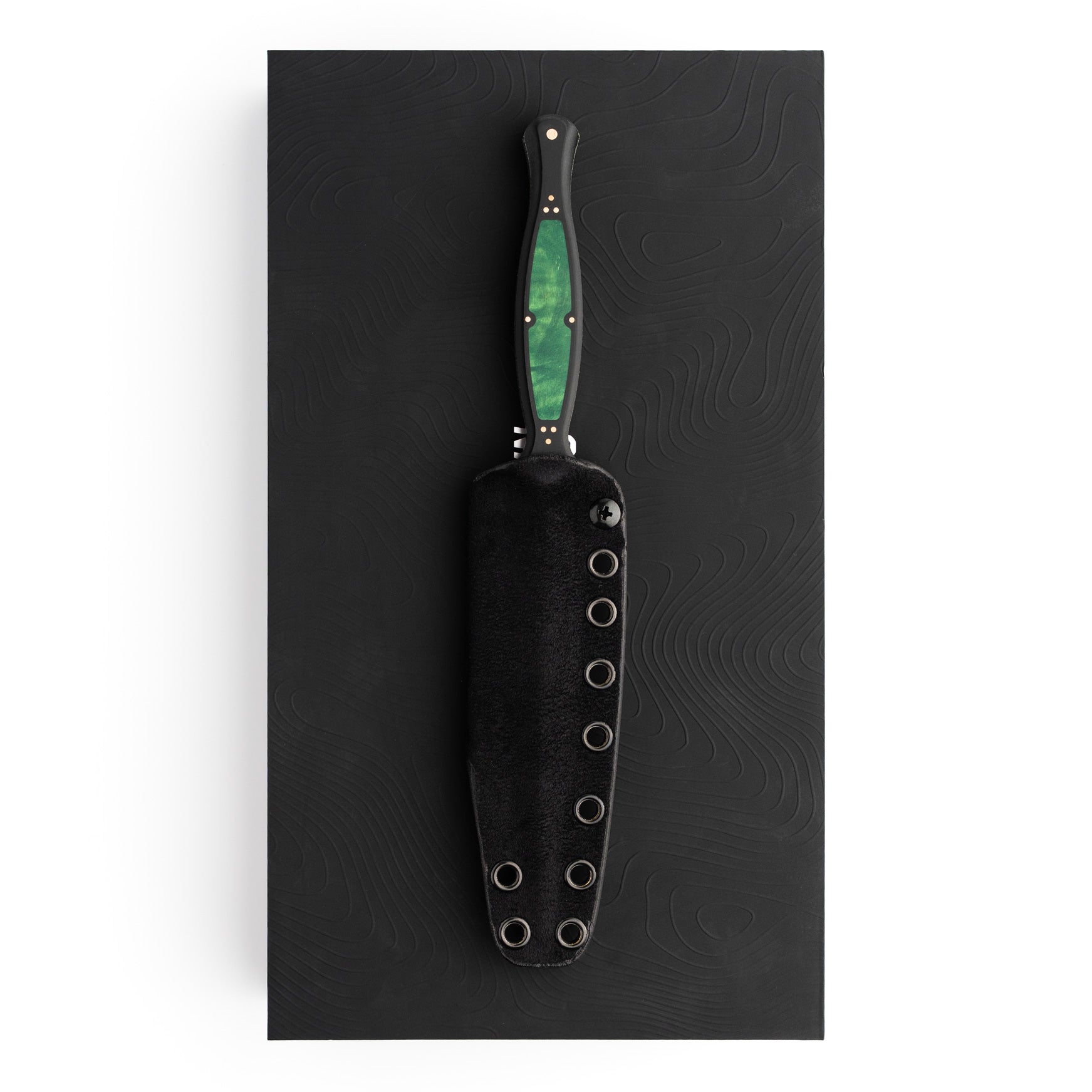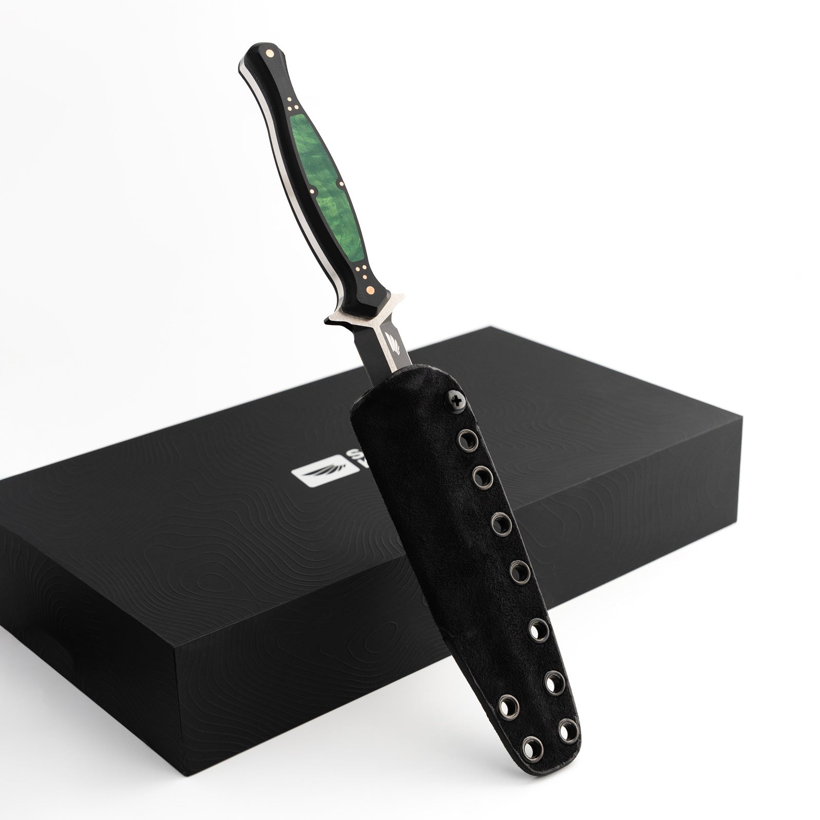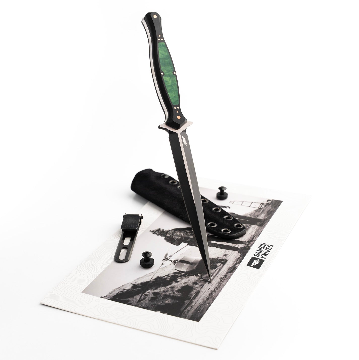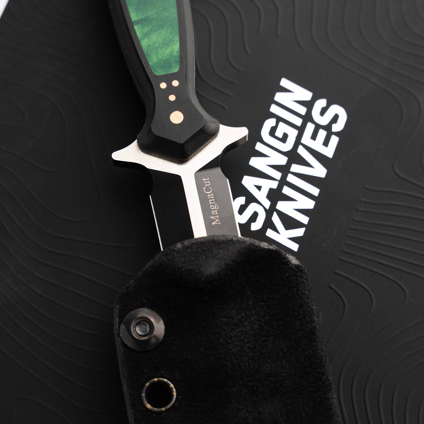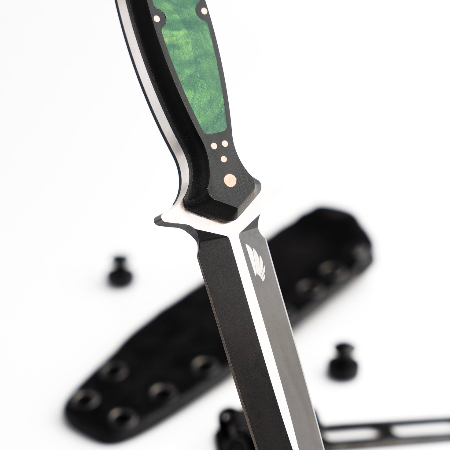 The handle of the FKX Dagger is made from Black Paper Micarta, providing a durable yet comfortable grip for optimal maneuverability. A stunning, intricately carved jade maple inlay adorns the handle, featuring a custom geometric pattern that symbolizes the symmetry and attention to detail embodied in the dagger's design. Each jade maple inlay is meticulously set by hand to ensure perfect alignment, exemplifying the dedication to craftsmanship that Sangin Knives is known for. Additionally, the handle is secured with ten individually set and polished press pins, seamlessly blending functionality with aesthetics while ensuring the structural integrity of the handle. No detail has been overlooked in the creation of this dagger, and we are proud to present the Custom FKX Dagger as one of the finest pieces ever produced, paying homage to the iconic Fairbairn-Sykes style.