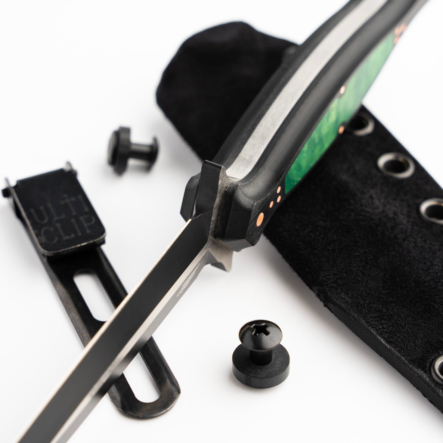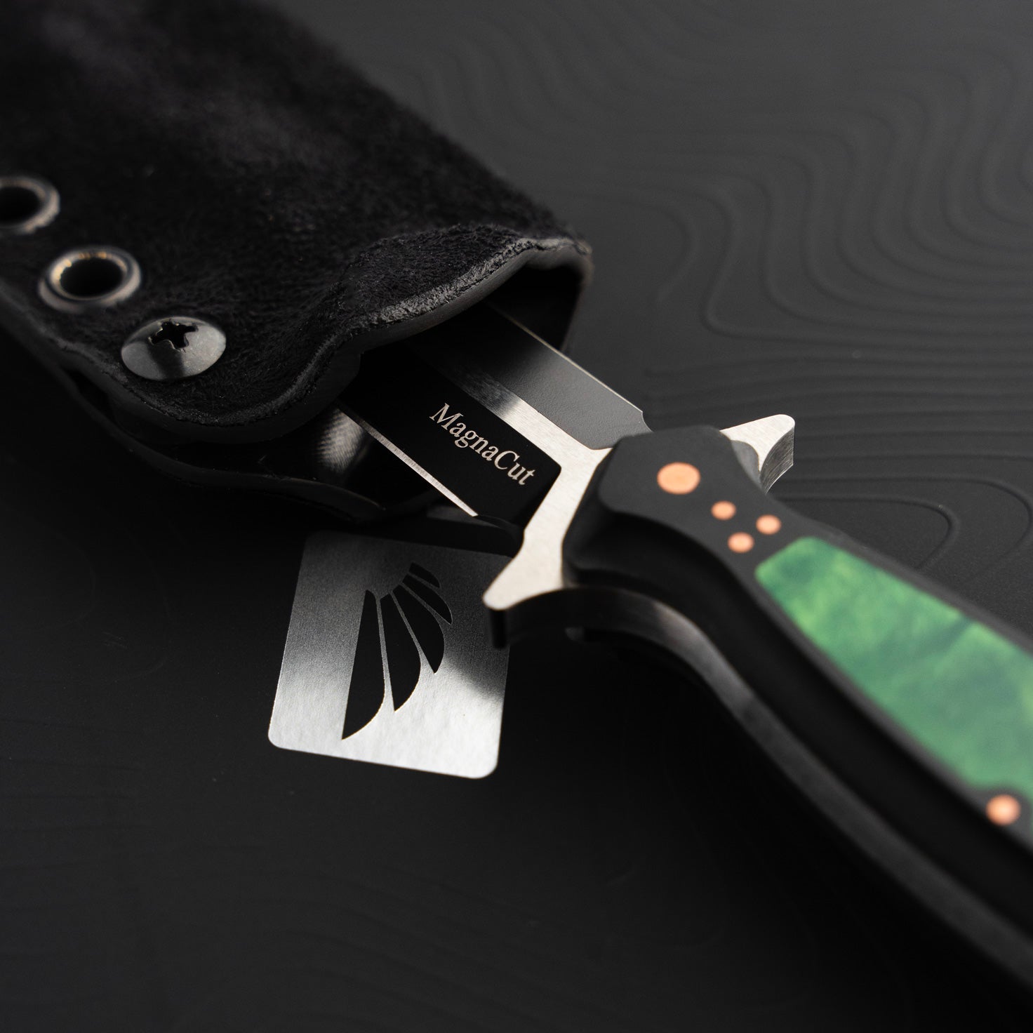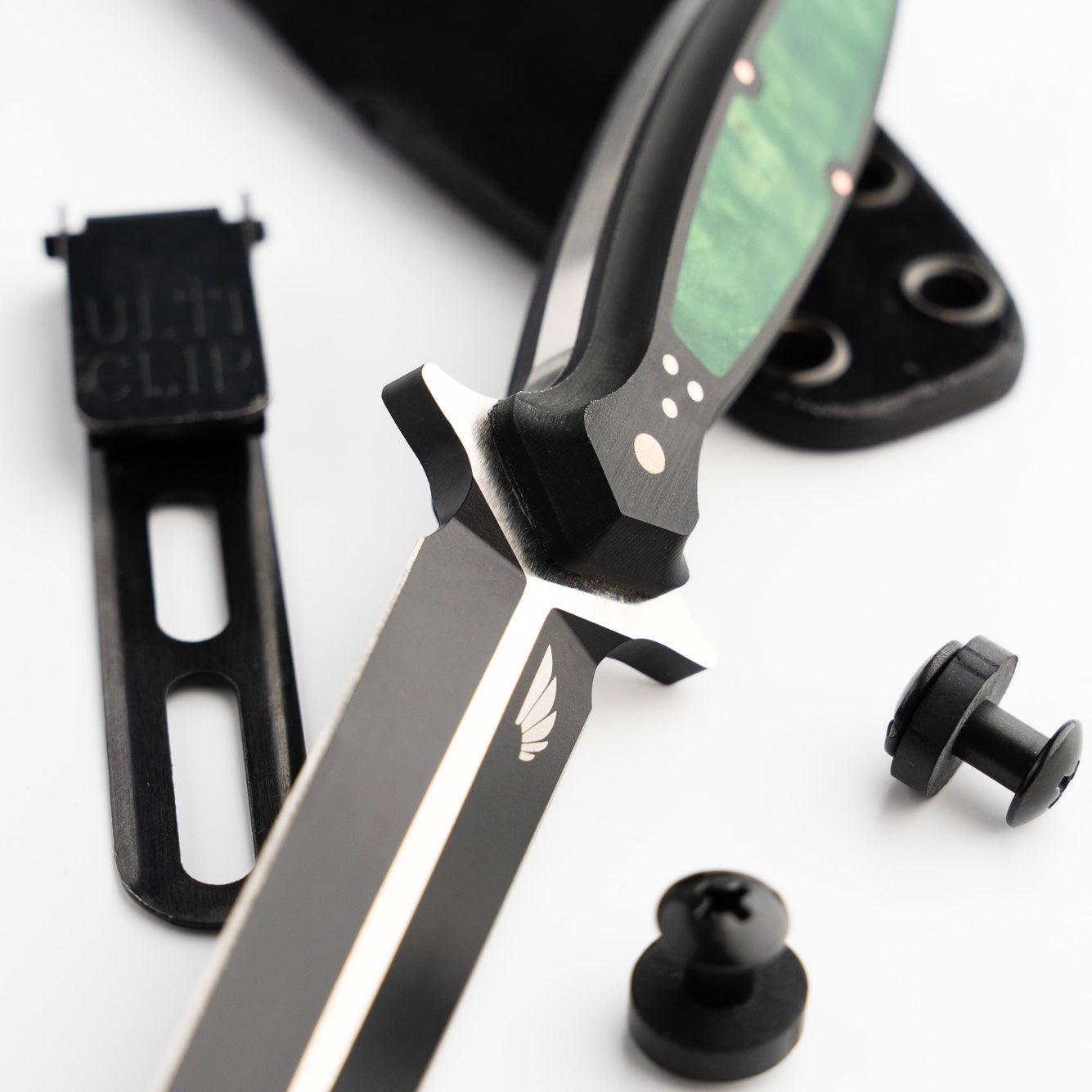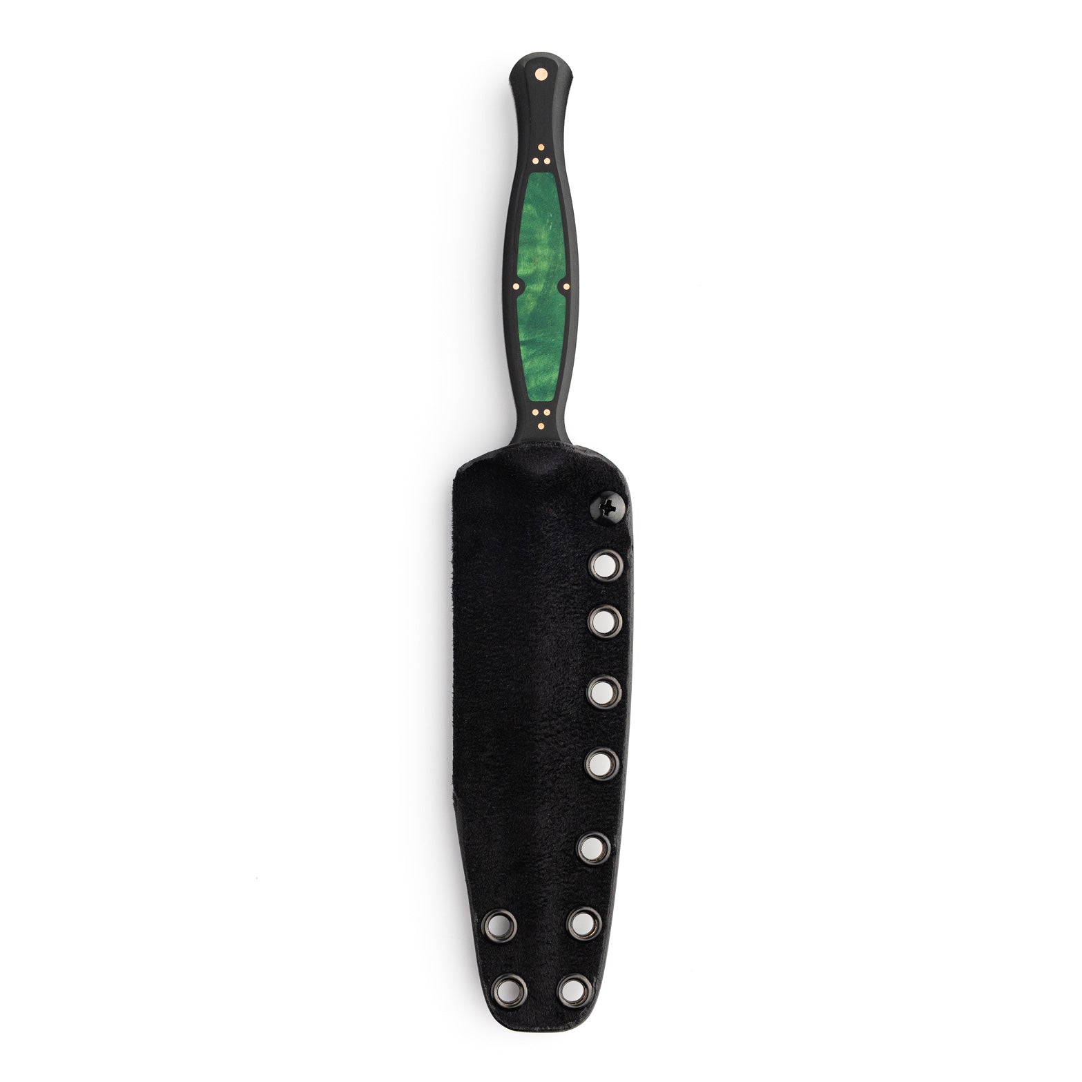 The handle of the FKX Dagger is made from Black Paper Micarta, providing a durable yet comfortable grip for optimal maneuverability. A stunning, intricately carved jade maple inlay adorns the handle, featuring a custom geometric pattern that symbolizes the symmetry and attention to detail embodied in the dagger's design. Each jade maple inlay is meticulously set by hand to ensure perfect alignment, exemplifying the dedication to craftsmanship that Sangin Knives is known for. Additionally, the handle is secured with ten individually set and polished press pins, seamlessly blending functionality with aesthetics while ensuring the structural integrity of the handle. No detail has been overlooked in the creation of this dagger, and we are proud to present the Custom FKX Dagger as one of the finest pieces ever produced, paying homage to the iconic Fairbairn-Sykes style.