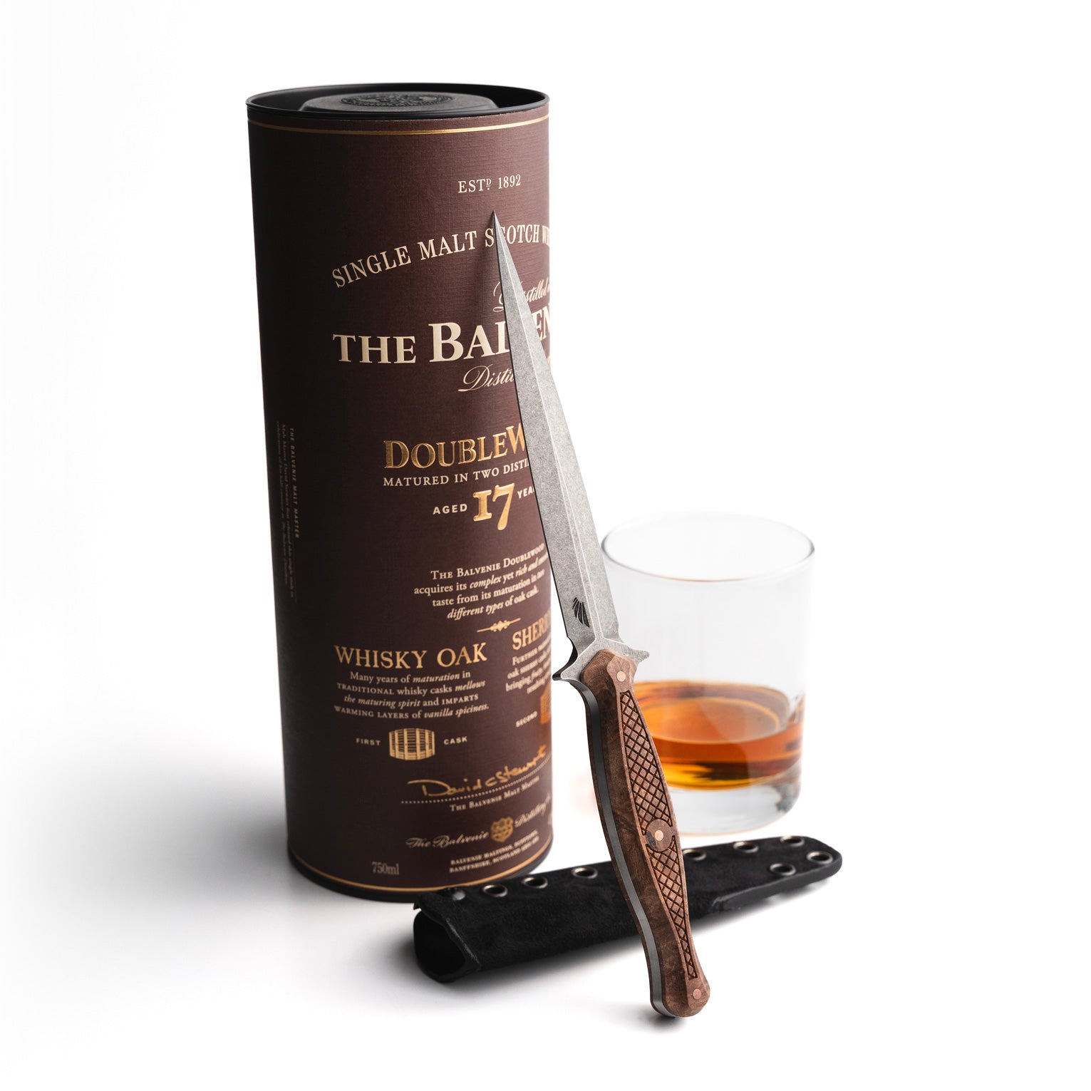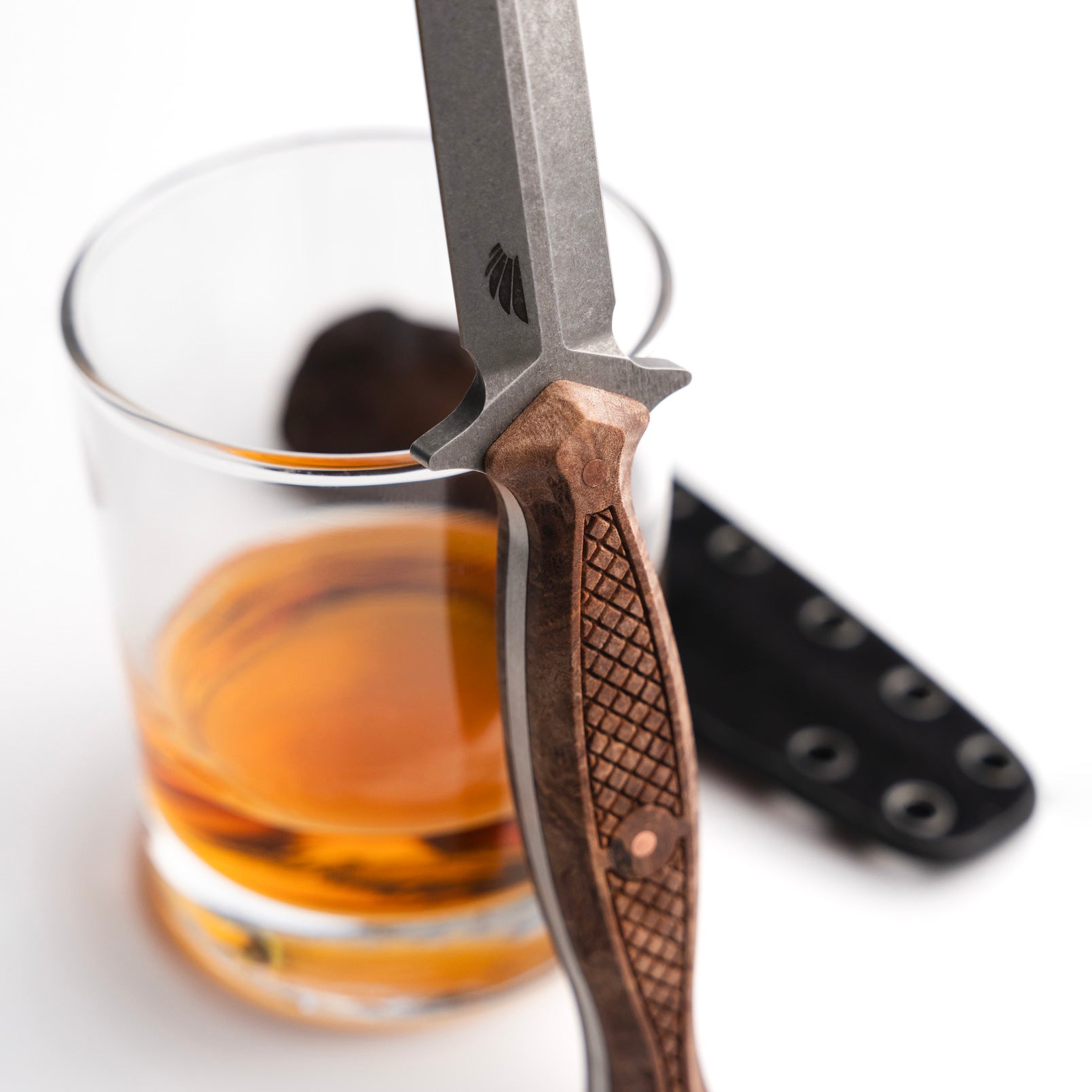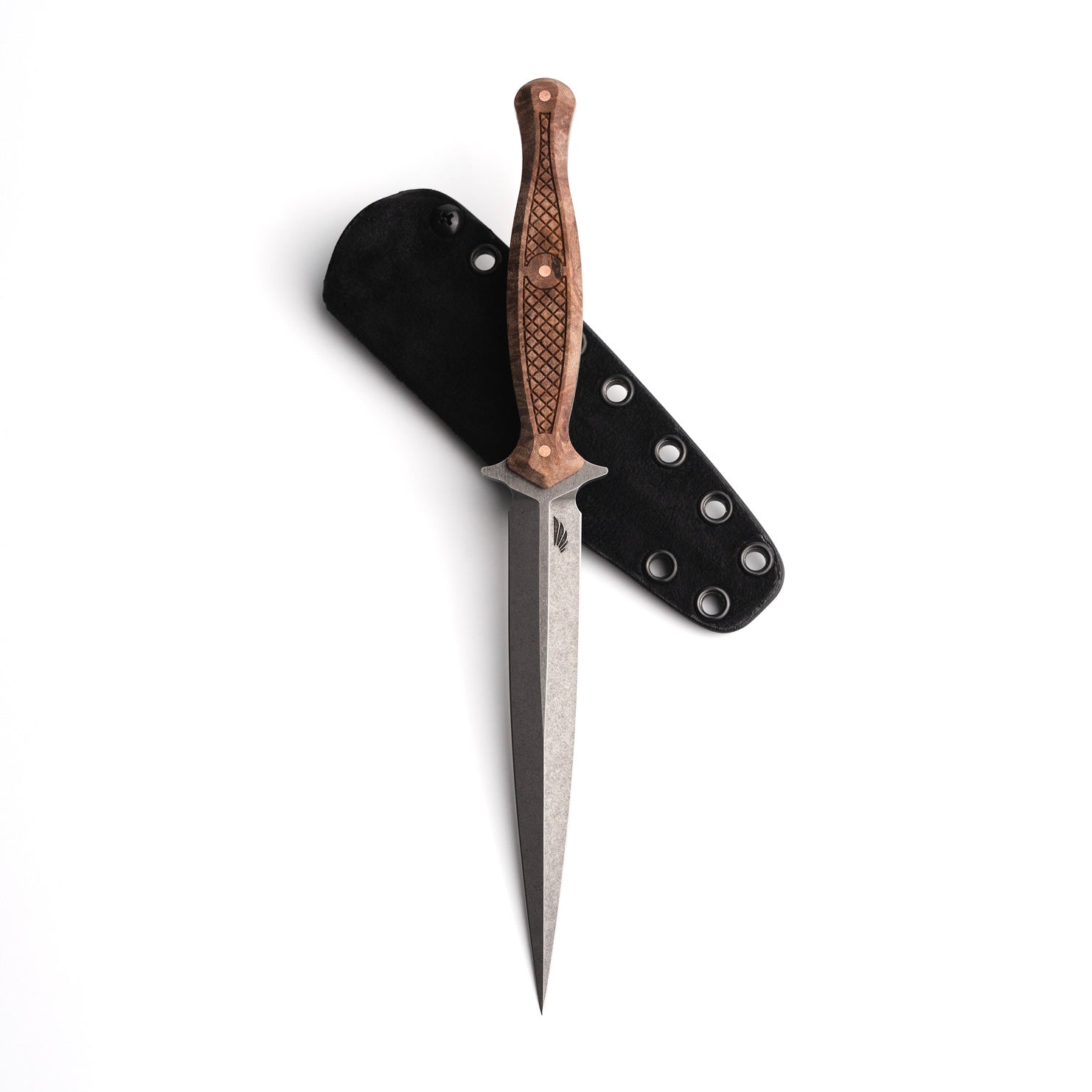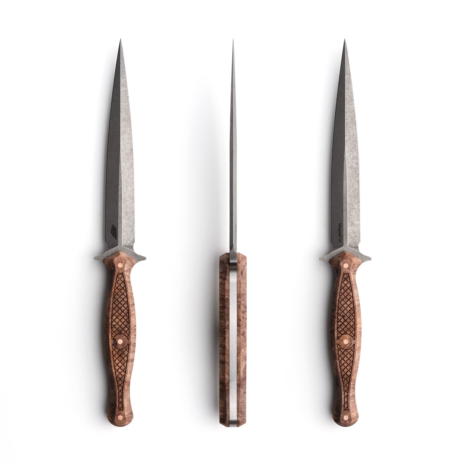 The handle of the FKX Dagger is made from Maple Burl wood, providing a durable yet comfortable grip for optimal maneuverability. These handles were finished with pointed checkering that mimics the grip of a classic wooden rifle. Additionally, the handle is secured with three individually set and polished copper pins, seamlessly blending functionality with aesthetics while ensuring the structural integrity of the handle. No detail has been overlooked in the creation of this dagger, and we are proud to present the Custom Maple Burl FKX Dagger as another fine piece produced, paying homage to the iconic Fairbairn-Sykes style.