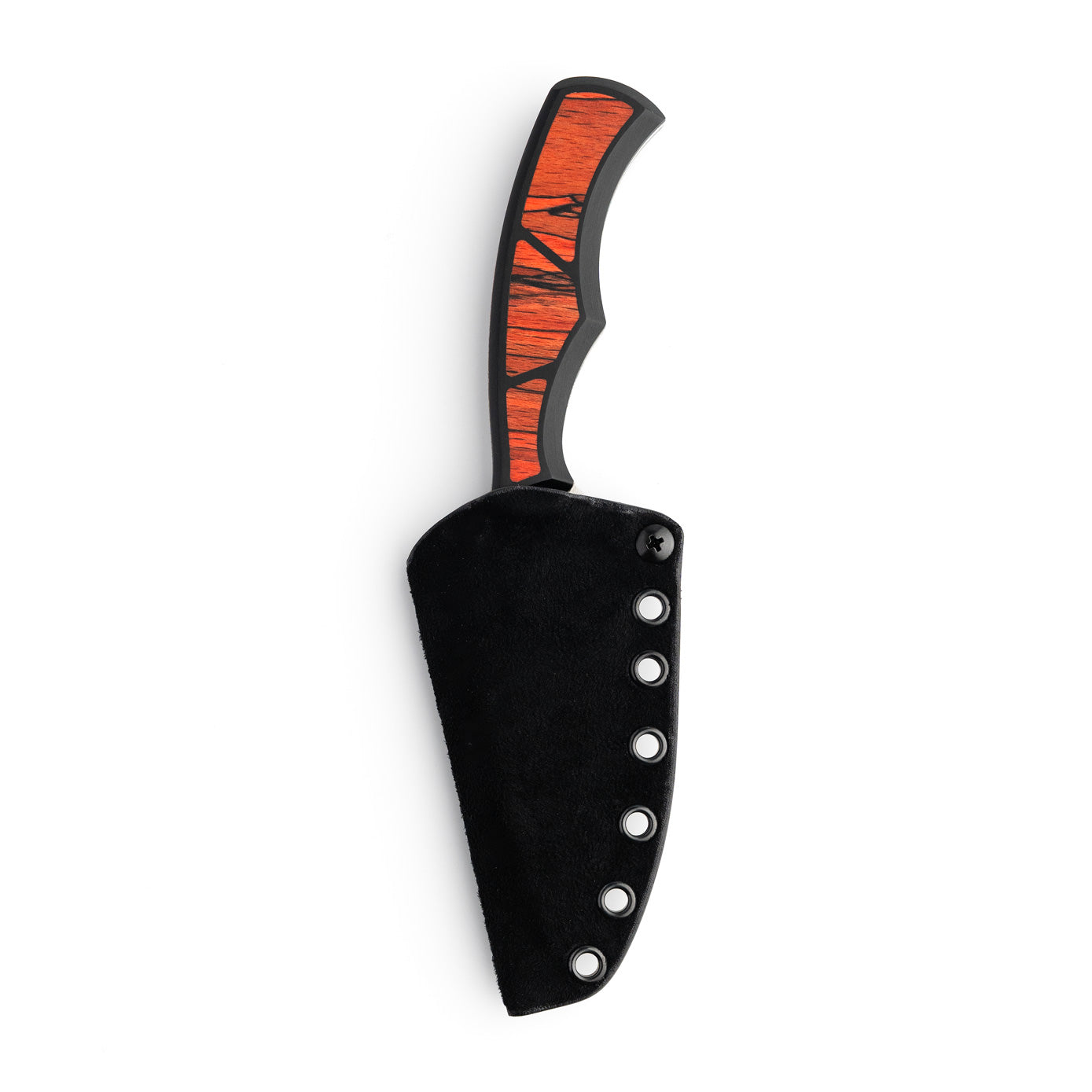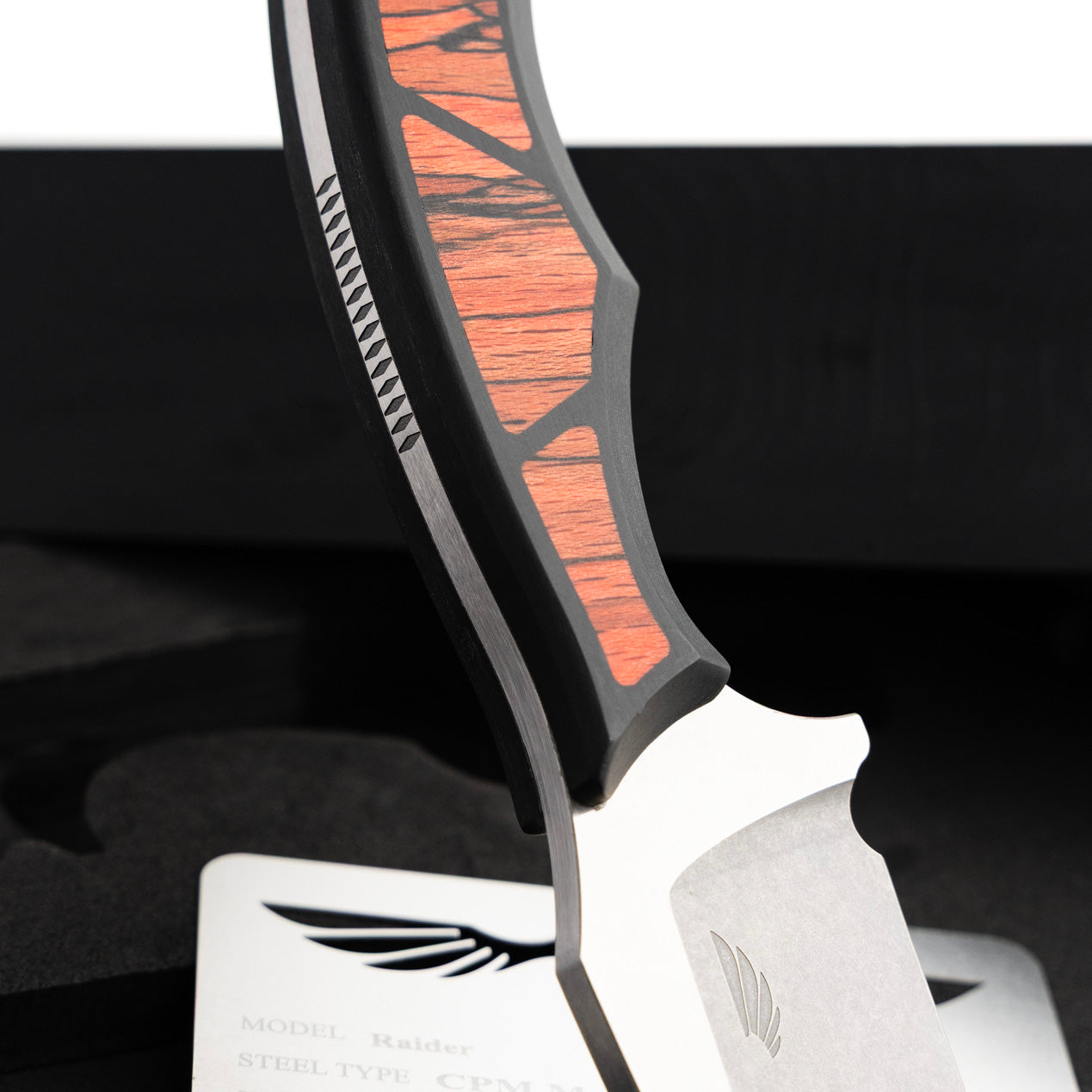 Beyond its remarkable capabilities, the Raider Red Spalted Beech stands as a genuine work of art. The handle features hand-fit custom Red Spalted Beech inlays that seamlessly sit upon a strong black micarta base, delivering both aesthetic appeal and robust durability. Each custom Raider is polished by hand, a labor-intensive process that takes hours of meticulous work to ensure that every detail is perfect. The spine of the handle showcases an intricate weave engraving design that not only adds a unique visual element but also complements the overall look and feel of this exceptional blade. This intricate craftsmanship transforms the Raider into more than just a tool; it becomes a statement piece that reflects the dedication and passion poured into its creation.