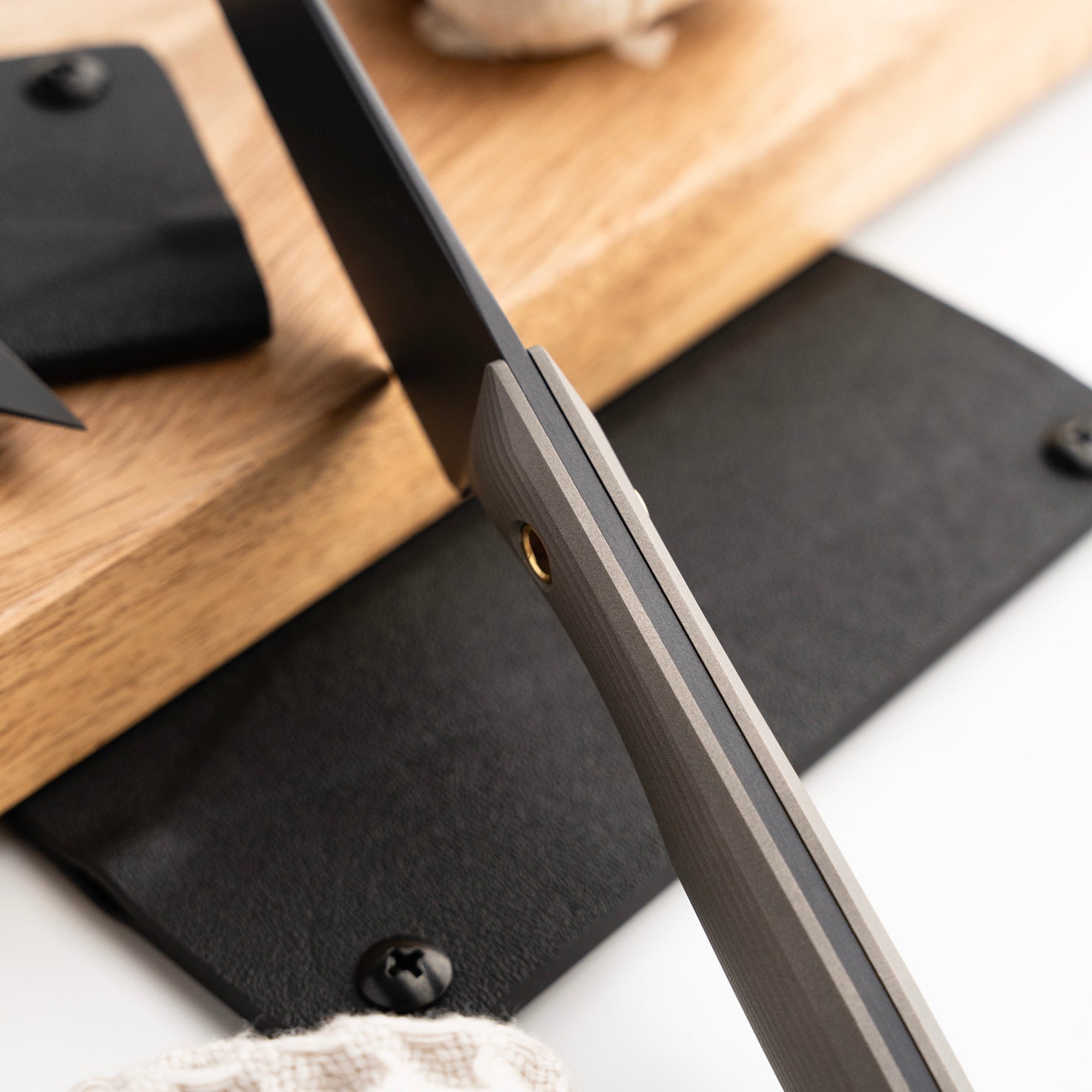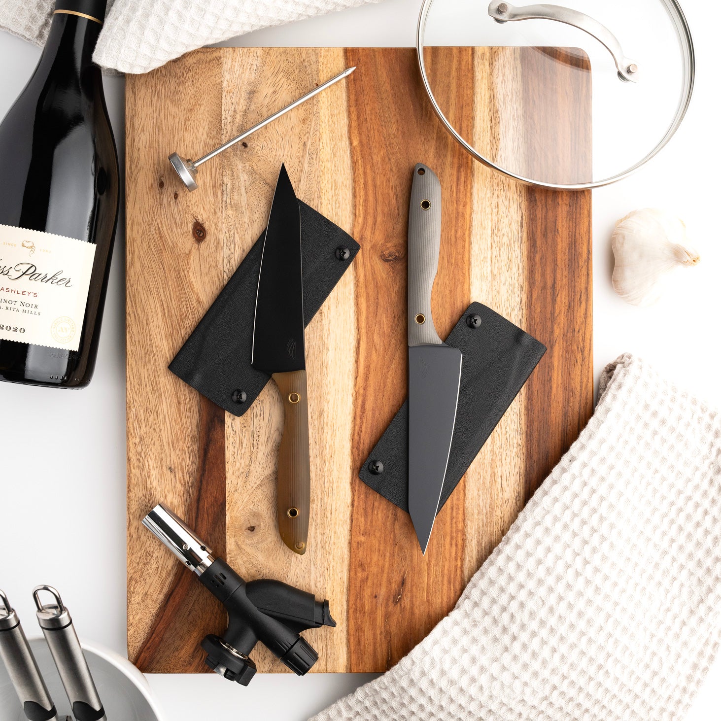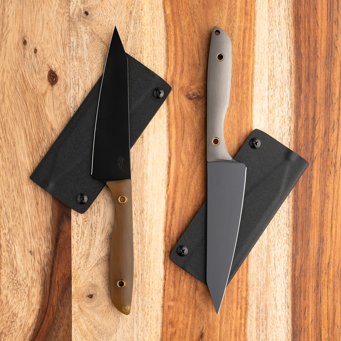 Introducing the new Sangin Knives Petty knife, where adventure meets culinary excellence. Inspired by our passion for the great outdoors and with a dedicated audience in mind, we crafted our very first culinary piece that doubles as an outdoorsman’s dream campsite kitchen knife. As avid adventurers, we understand the need for reliable tools that blend seamlessly into both rugged environments and refined kitchen spaces. The result is the ultimate sidekick for any campsite or kitchen, featuring a hard Kydex sleeve for protection on outdoor excursions while maintaining an impressive presence in any magnetic or traditional kitchen block.