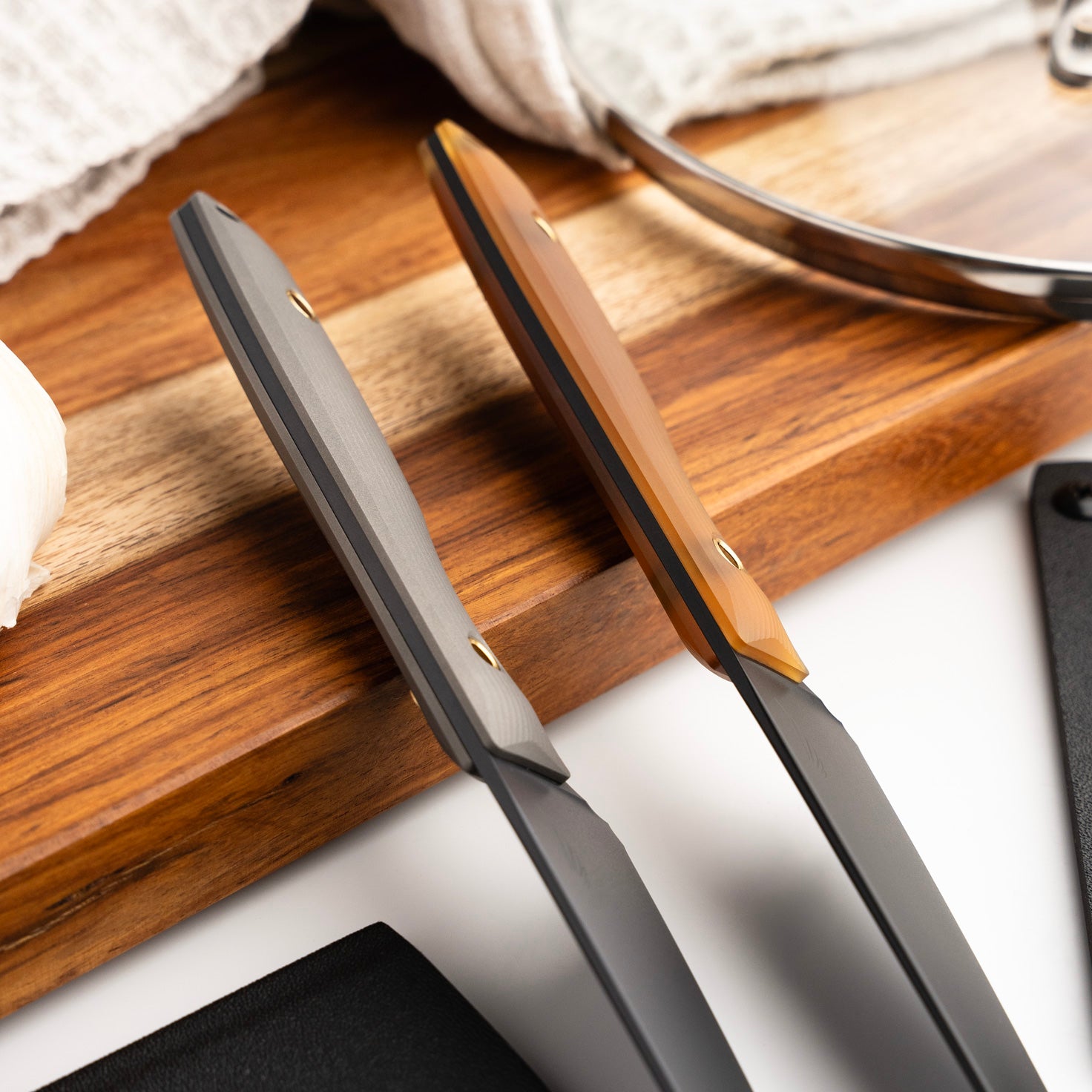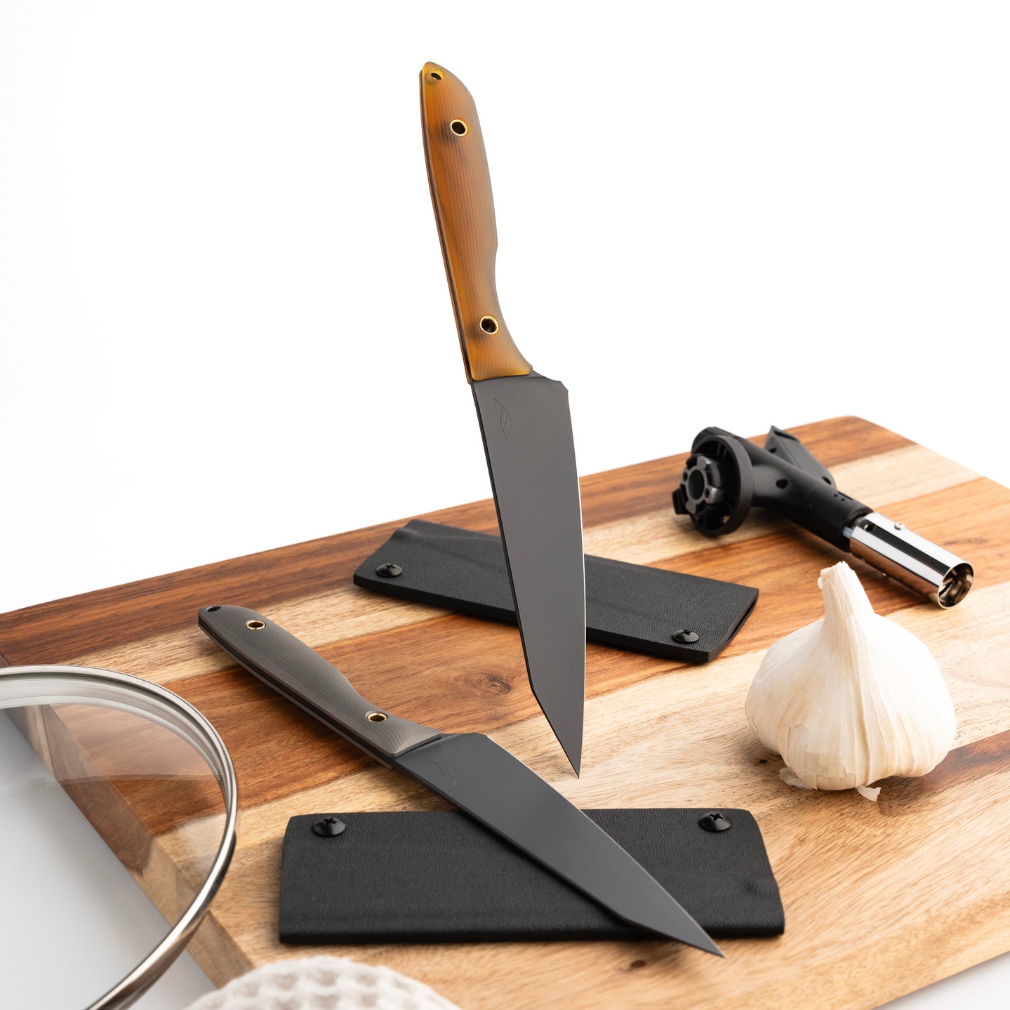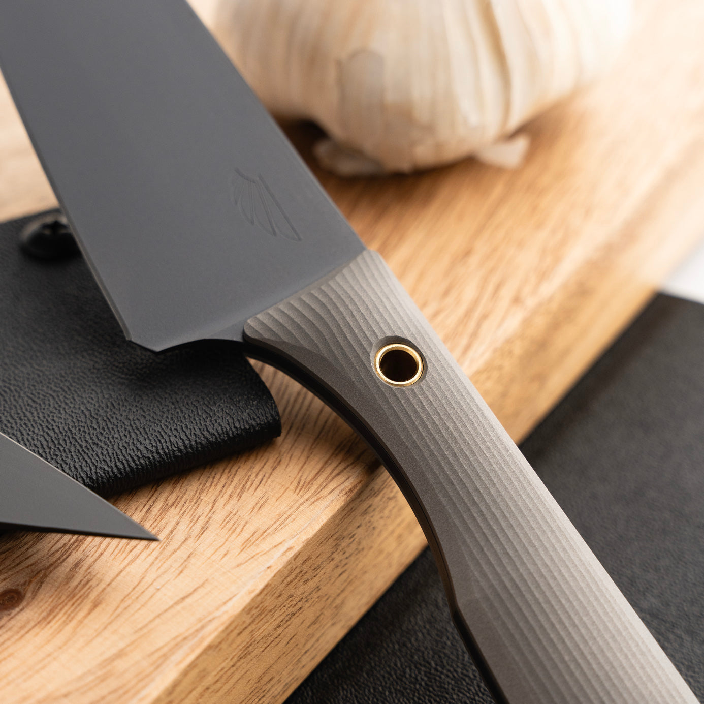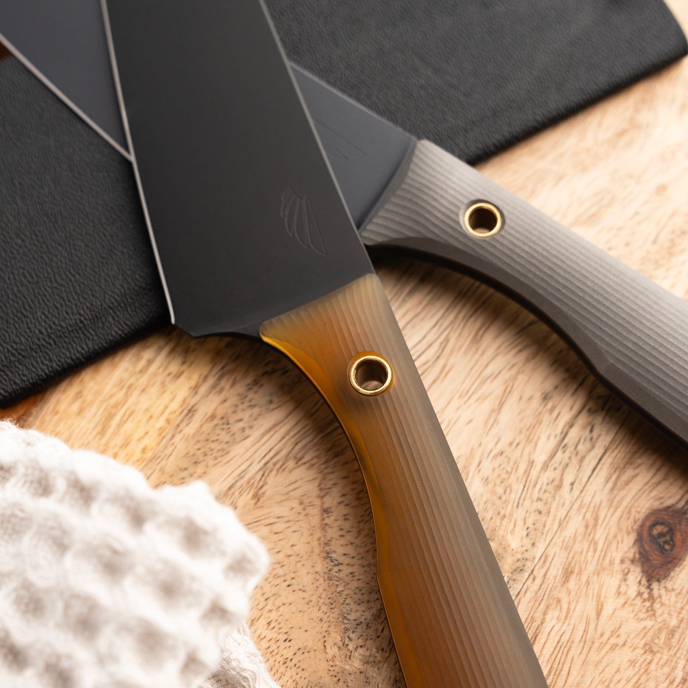 This exceptional knife is constructed from premium CPM Magnacut steel, a material known for its superior edge retention, corrosion resistance, and ease of sharpening, making it the perfect choice for culinary tasks. What sets our petty knife apart from the rest is its unique Titanium handle finish, offering added durability and a distinctive aesthetic. Titanium’s resistance to corrosion ensures longevity, while its slightly increased weight provides a well-balanced feel during use. Alternatively, for those who prefer a different grip, we offer a translucent Ultem 1000 handle. This highly durable material is not only resistant to heat and bacteria but also lightweight yet substantial enough to enhance overall balance, ensuring comfort during extended use. Each blade features a food-safe coating for easy cleaning and maintenance, and the hand-rounded spine eliminates hotspots for precision tasks. With a reinforced reverse tanto tip, this knife is thoughtfully designed for durability, making it an excellent choice for puncturing, filleting, and handling intricate cutting tasks.