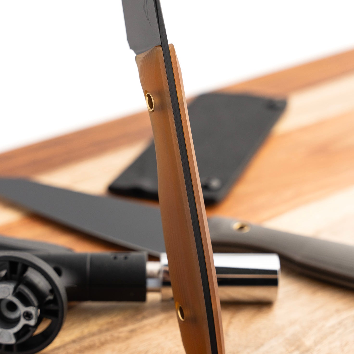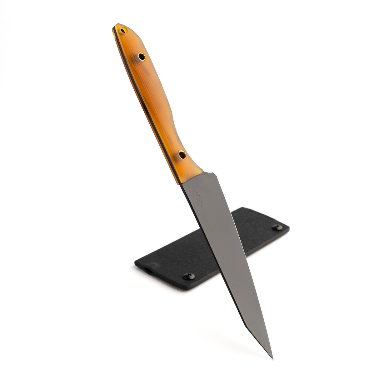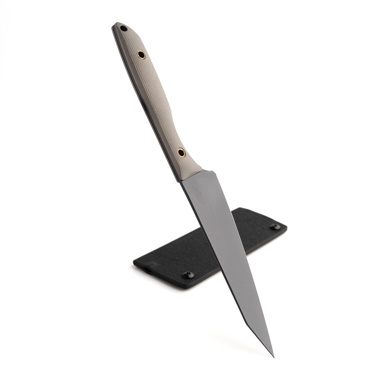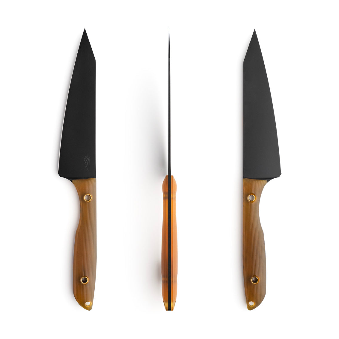 This exceptional knife is constructed from premium CPM Magnacut steel, a material known for its superior edge retention, corrosion resistance, and ease of sharpening, making it the perfect choice for culinary tasks. What sets our petty knife apart from the rest is its unique Titanium handle finish, offering added durability and a distinctive aesthetic. Titanium’s resistance to corrosion ensures longevity, while its slightly increased weight provides a well-balanced feel during use. Alternatively, for those who prefer a different grip, we offer a translucent Ultem 1000 handle. This highly durable material is not only resistant to heat and bacteria but also lightweight yet substantial enough to enhance overall balance, ensuring comfort during extended use. Each blade features a food-safe coating for easy cleaning and maintenance, and the hand-rounded spine eliminates hotspots for precision tasks. With a reinforced reverse tanto tip, this knife is thoughtfully designed for durability, making it an excellent choice for puncturing, filleting, and handling intricate cutting tasks.